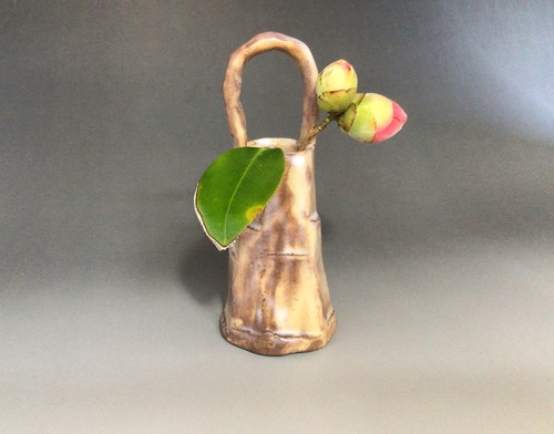 小さなサイズの花入れは飾る場所を選ばずに何処にでも置いて頂くことが出来る作品です。愛らしい形に手付きのデザイン、萩焼らしい土味が風情を醸し出し、日常生活に彩りを与えてくれる買いたい萩焼作品です。口が小さく、手付きがあることにより花の留まりも良く活けやすく花が映える花入れです。