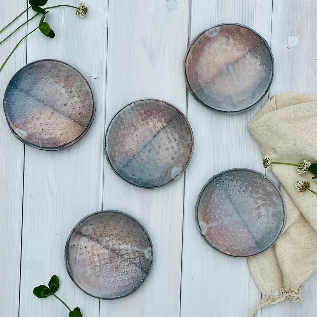 2枚組です。掛け分けた化粧土の色が美しい丸皿です。