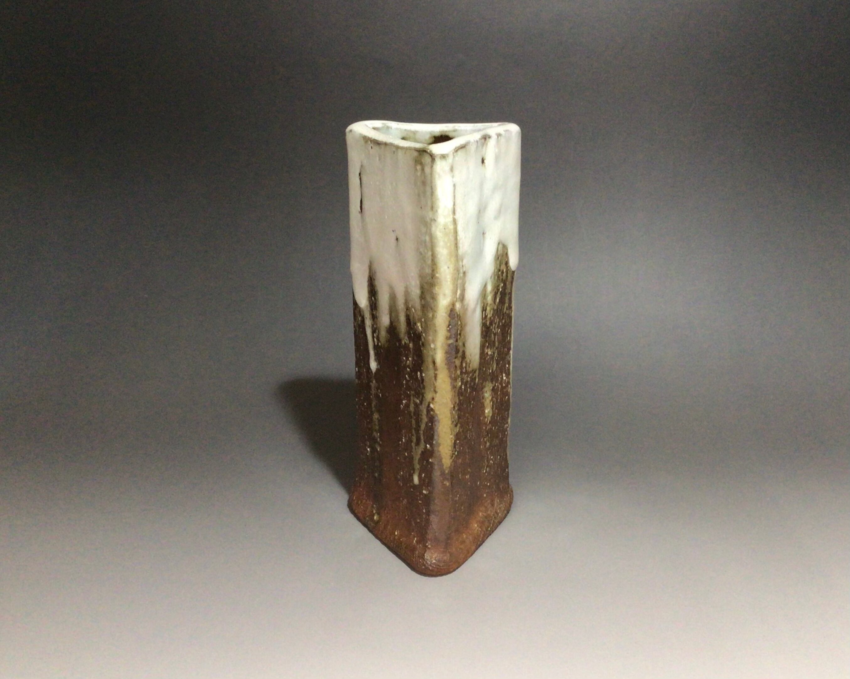 小ぶりなサイズの花入れは飾る場所を選ばずに何処にでも置いて頂くことが出来ると思います。スッキリとした形に萩焼らしい釉調が風情を醸し出し、日常生活に彩りを与えてくれる買いたい萩焼作品です。鉄分の多い赤土に白萩釉をどっぷりと掛け、花が映える花入れです。