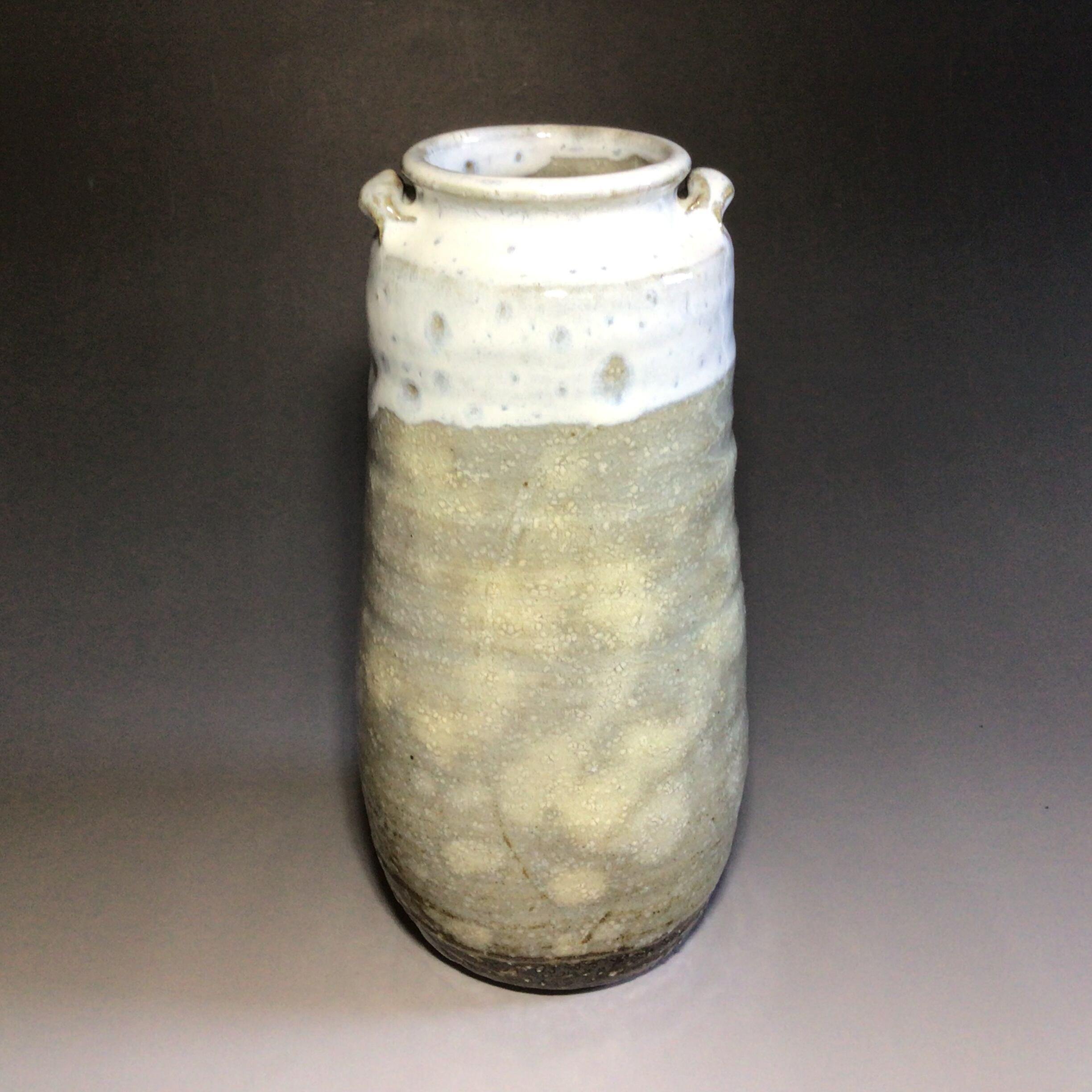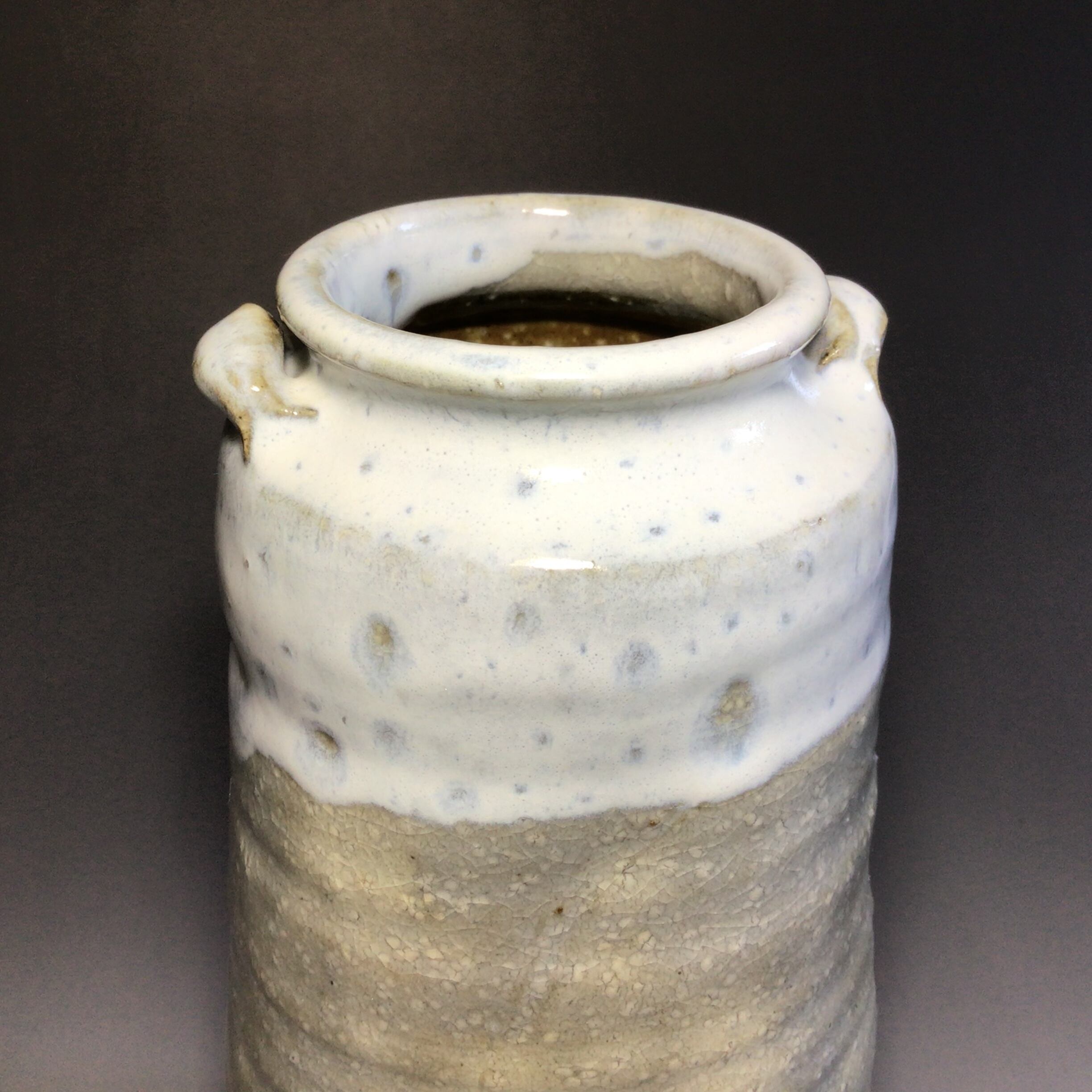 萩焼らしい土味に白萩釉をみぞれの様に装飾した花入です。スッキリとした形に可愛らしい耳付きが、日常生活に彩りを与えてくれる買いたい萩焼作品です。口が小さく、花の留まりも良く活けやすく花が映える花入れです。