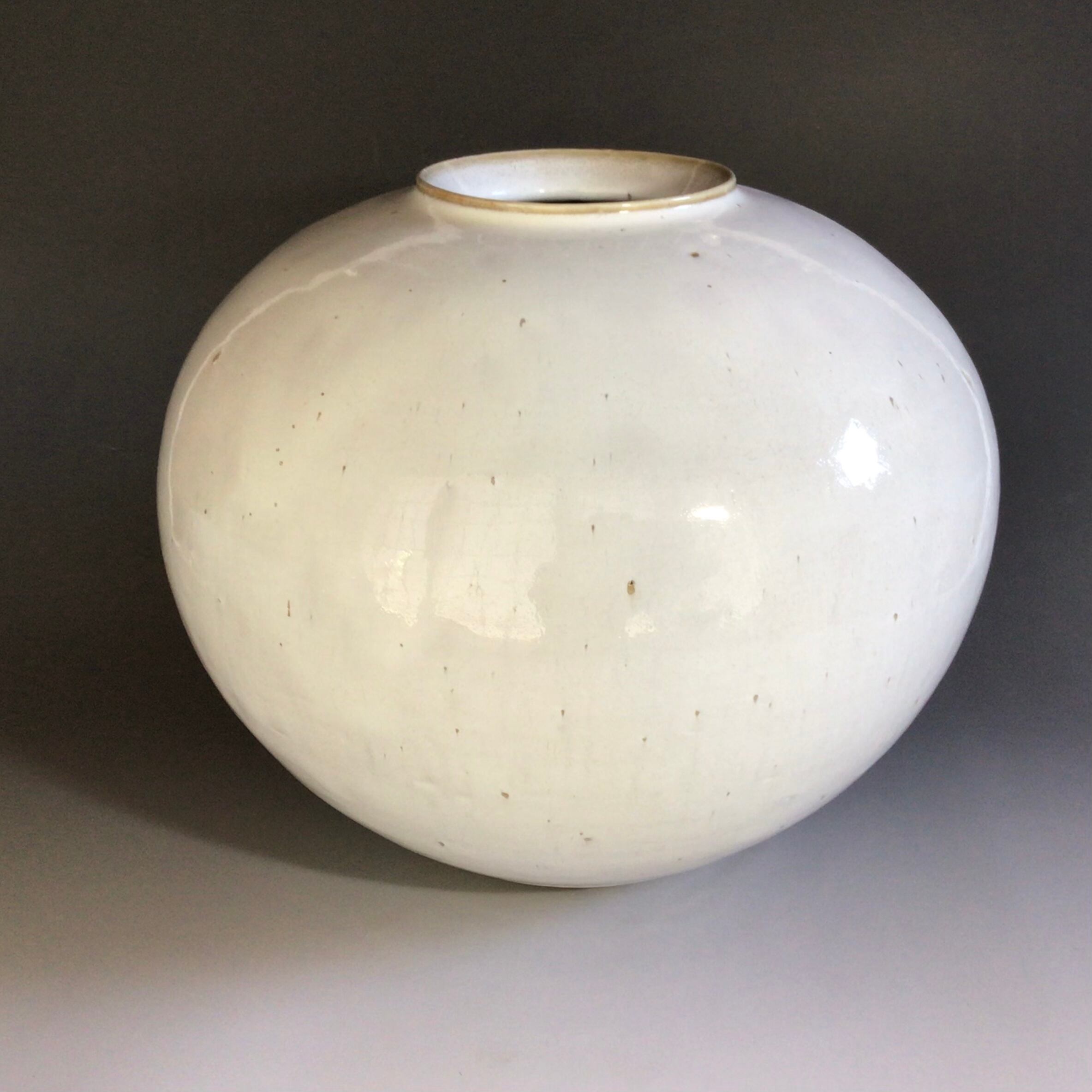 すっきりとした白萩釉と張りの有る形が美しい1点物の会いたい萩焼「一期一会」の作品です。土に小砂を多く混ぜる事により、成型は難易度が上がりますが焼成時に砂が溶け、結晶の様相を呈しその景色が大変美しく見えます。白萩と小砂の流れを見て戴きたい作品です。
