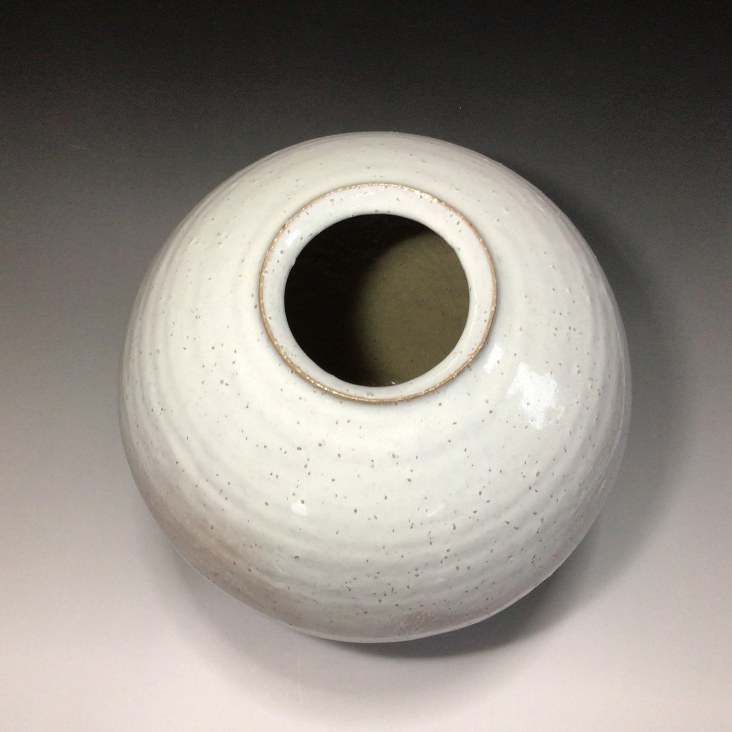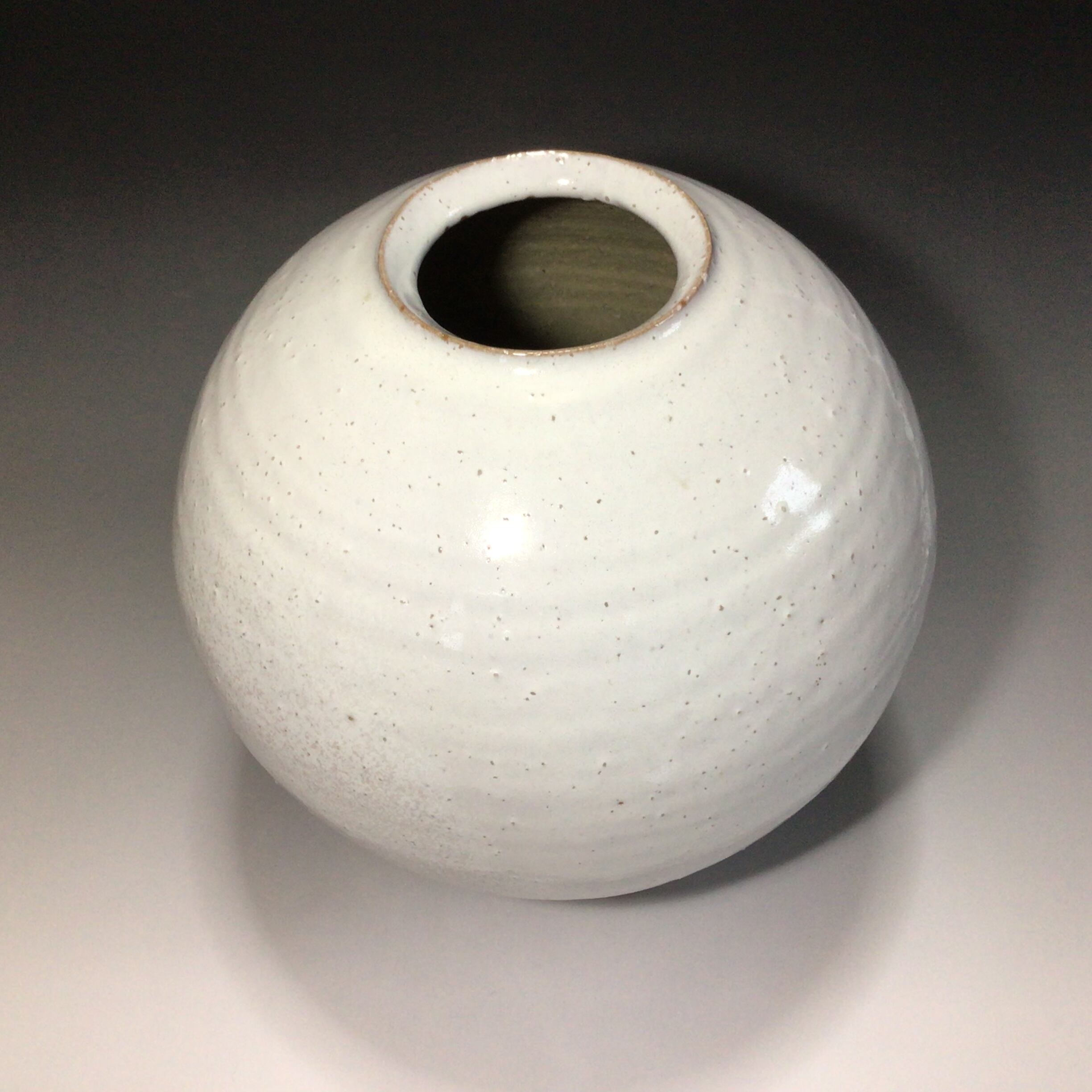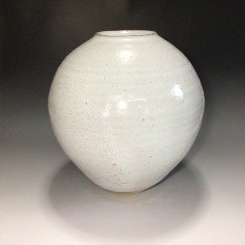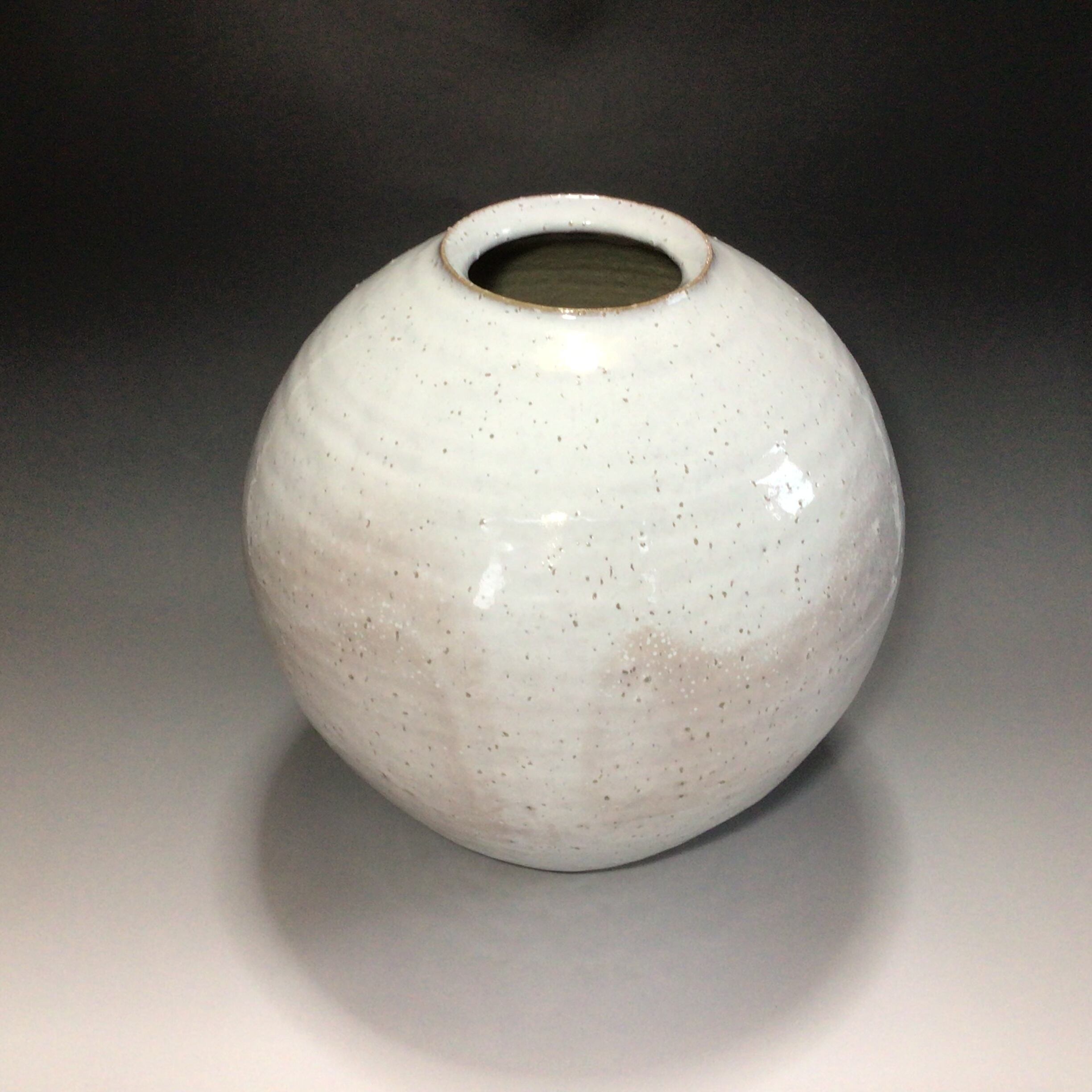 登り窯による白萩と紫色の窯変のグラデーション、立ち姿が美しい1点物の会いたい萩焼「一期一会」の作品です。土に小砂を大量に練り込み、窯の炎を浴び小砂が溶ける事により結晶の様な装飾と土味を強調して表現しております。白萩と窯変、小砂結晶による表現を見て戴きたい作品です。