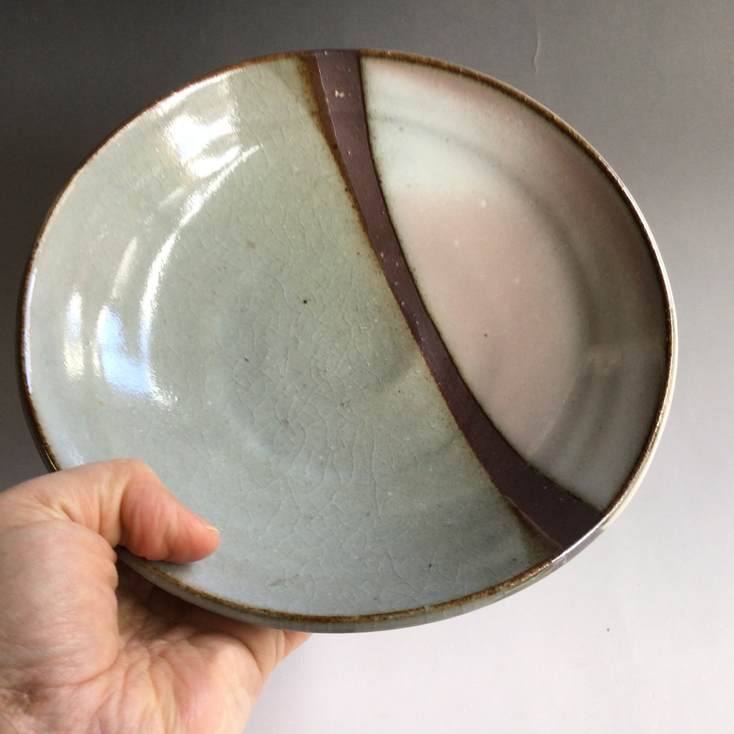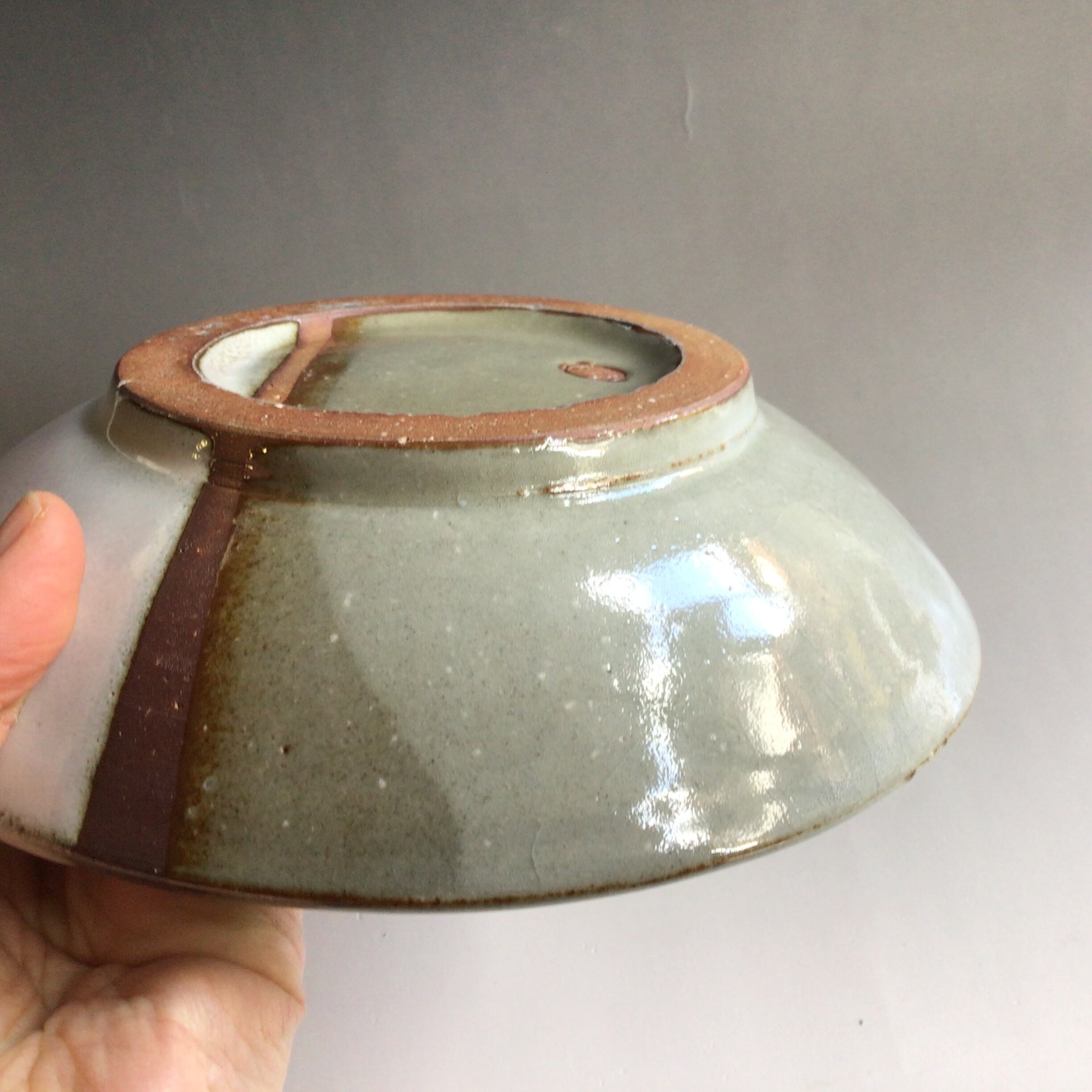 鉄分の多い土に透明釉と白萩釉の掛け分けで装飾致しました。深鉢形にシンプルな線文様と釉薬の流れの色合いが美しい7寸鉢です。