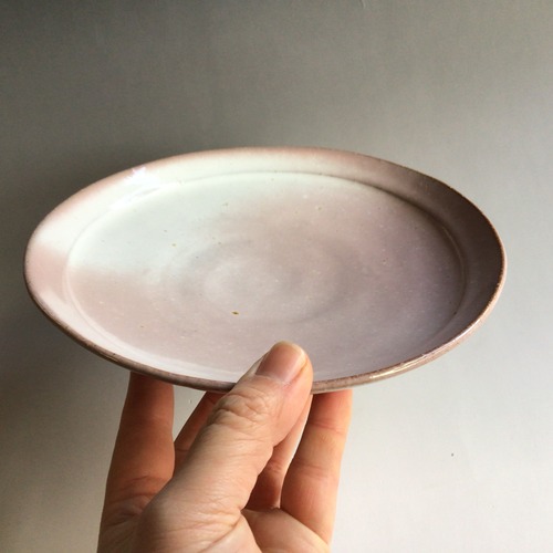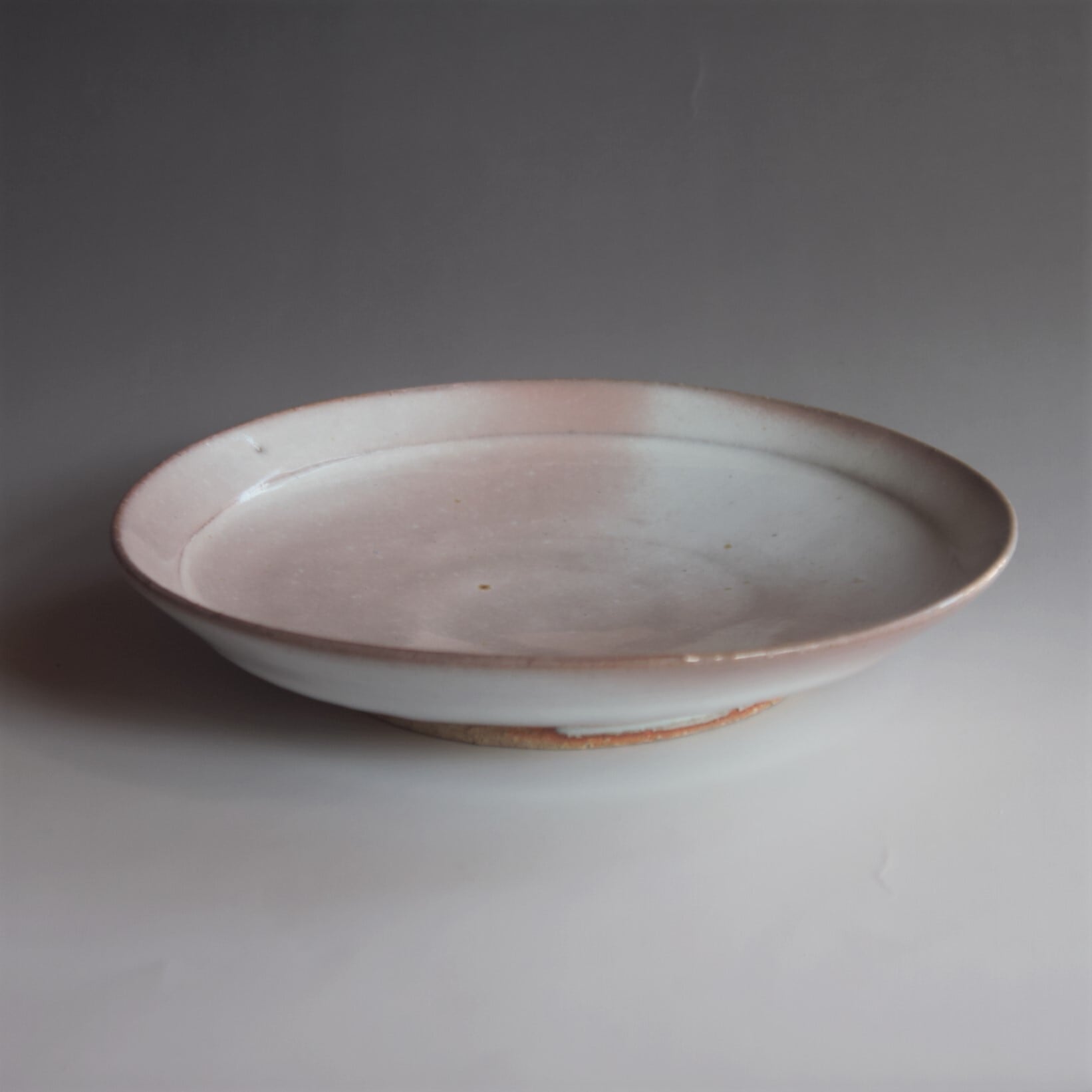 白萩釉のスッキリとした平皿です。窯変の薄ピンクのグラデーションが器の表情に変化を与えてくれます。菓子器や料理の器など色々なお使い方で楽しんで頂きたい作品です。