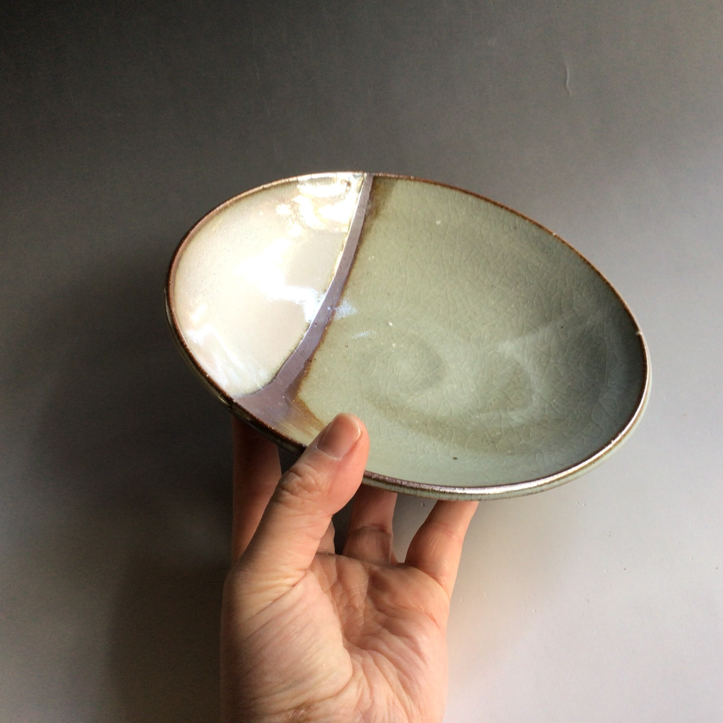鉄分の多い土に透明釉と白萩釉の掛け分けで装飾致しました。深鉢形にシンプルな線文様と釉薬の流れの色合いが美しい7寸鉢です。土の鉄分の色が強く出ております。