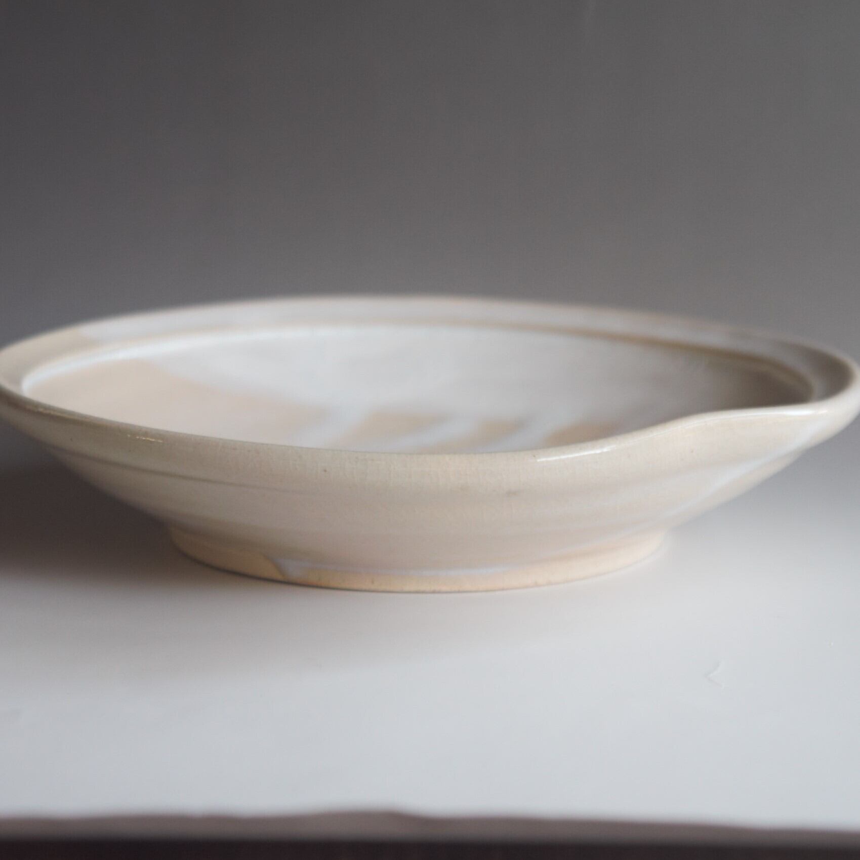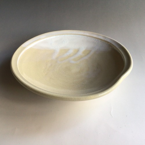姫土と呼ばれるきめの細かい土を使い、白萩釉を装飾掛けした萩焼らしい風情の土味と釉調が、日常に少し彩りを加えてくれる買いたい萩焼作品です。菓子器や料理の器など色々なお使い方で楽しんで頂きたい作品です。一か所口縁部に変化と動きを付けております。