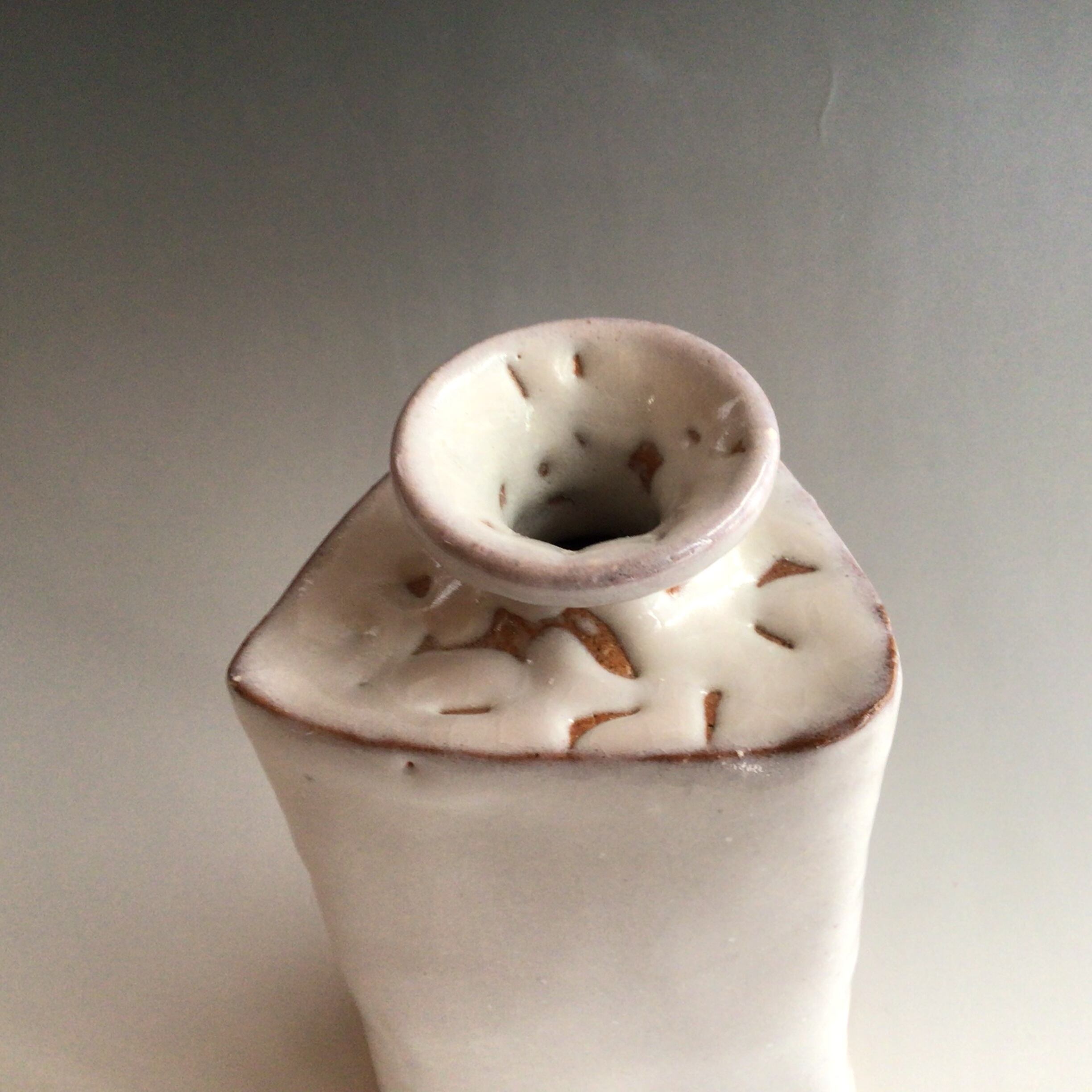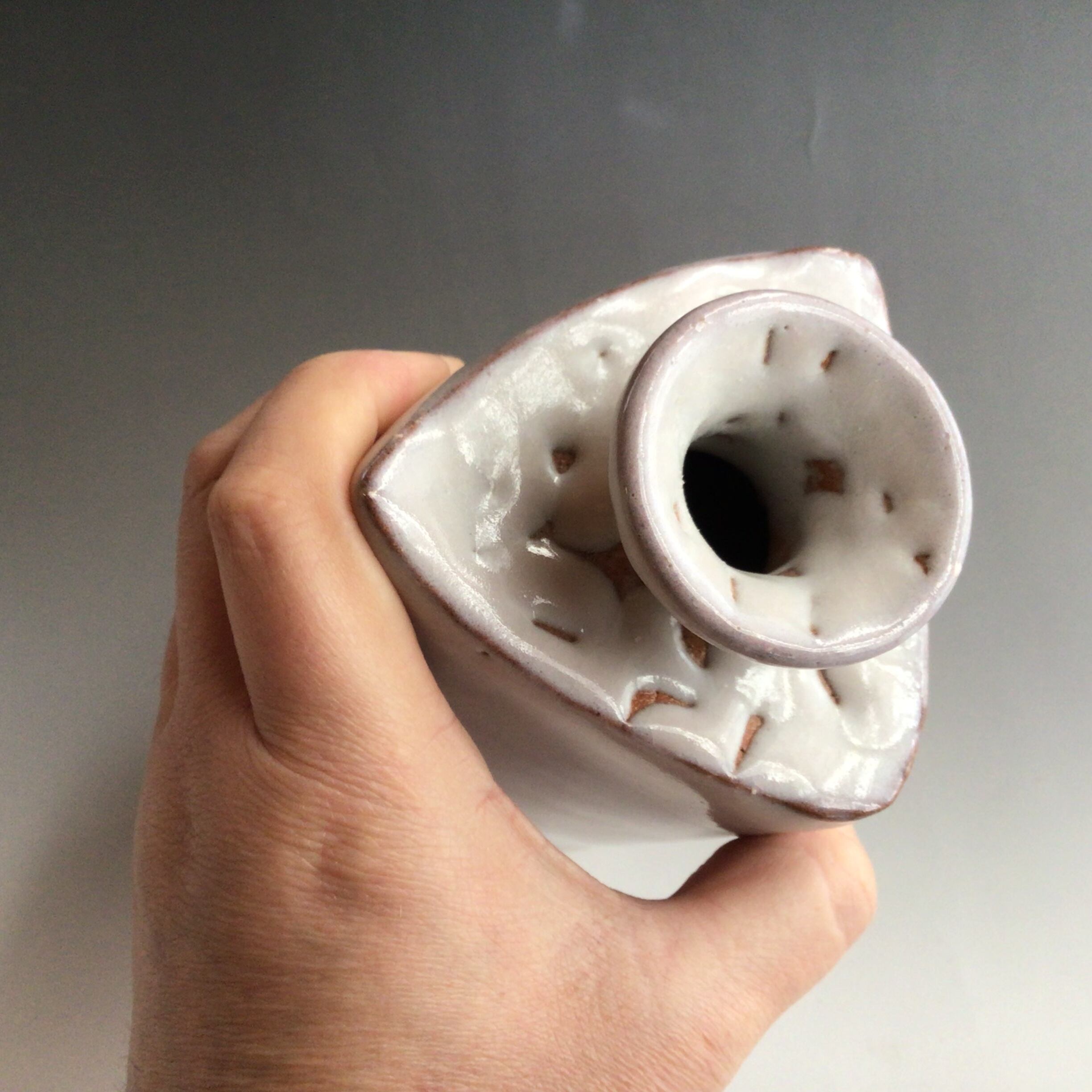 スッキリとした白萩が美しい花入れは場所を選ばずに何処にでも置いて頂け、飾る花を選びません。三角型に張り肩のデザイン白萩釉が風情を醸し出し、日常生活に彩りを与えてくれる買いたい萩焼作品です。口が小さく、花の留まりも良く活けやすく花が映える花入れです。